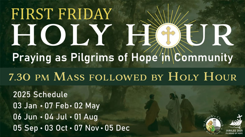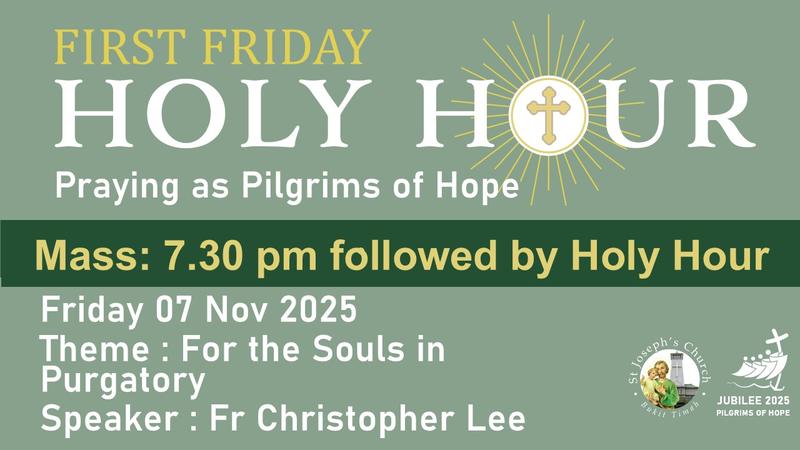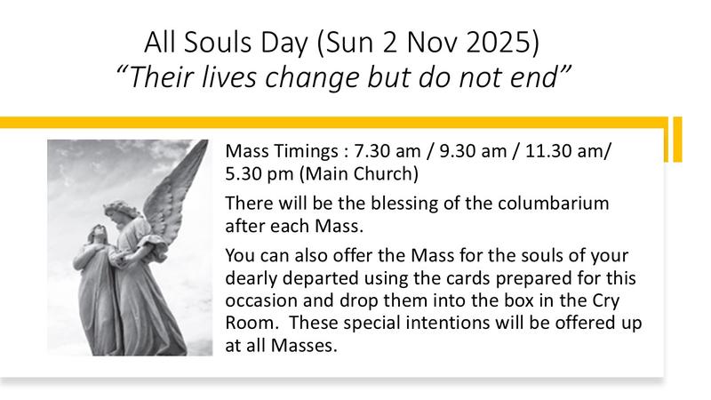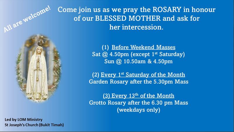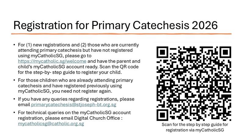 Parents seeking Baptism for their infant or child, please visit our website: St. Joseph’s Church, Bukit Timah. Download the ‘Infant Baptism Registration’ form (under Services>Sacraments>Baptism) and submit your registration with the relevant documents to the Parish Secretary.