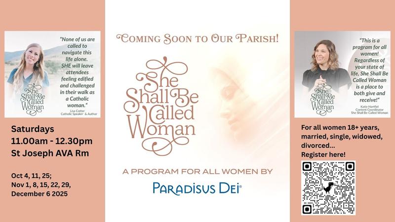 'She Shall be called Woman' (SHE) is a Catholic women’s program for parishes. It's where women 18 years and above can have honest discussions about the joys and challenges of modern womanhood.In our first season, the theme is 'Masterpiece of Creation' - how in the beginning, God gave women unique gifts that reveal His love for all life. Join us every Saturday 11am - 12.30pm starting October 4. All women 18+ years are welcome! Please register at: https://tinyurl.com/SJCBTSHE1