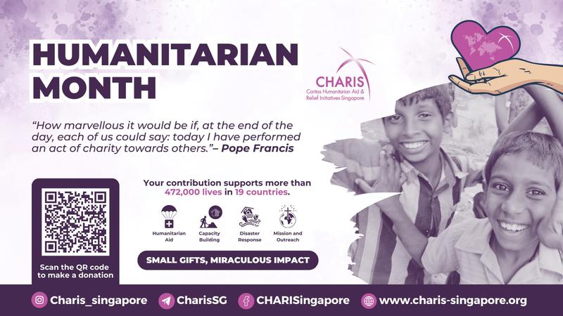 Donation envelopes are available in the parish. Alternatively, you can send a crossed cheque payable to “Humanitarian Aid Fund” with your name and contact information to: CHARIS, 55 Waterloo Street, #07-02 Catholic Centre, Singapore 187954. Please contact CHARIS at 6337-4119 or scan the QR code to visit their website for more information.