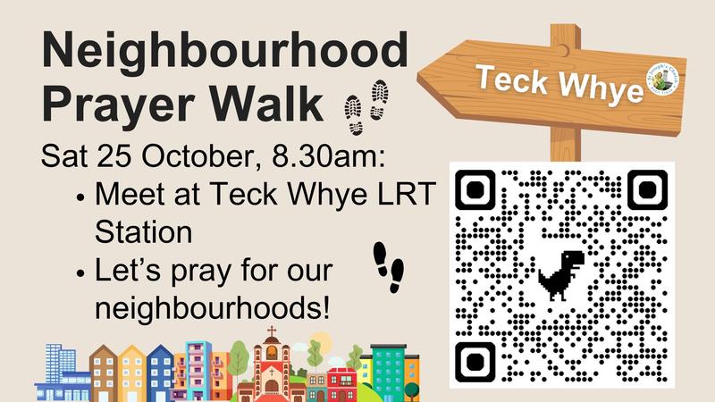 Come and pray for residents of Teck Whye as a community. Please meet at Teck Whye LRT Station at 8.30am. Please join the Neighbourhood Prayer Walk Whatsapp Community for updates: tinyurl.com/SJCBTNPW