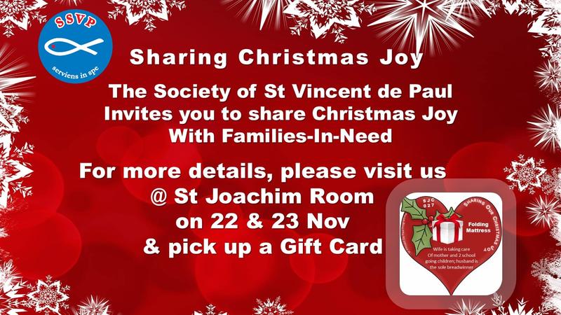 The Society of St Vincent De Paul invites the Parish community to share Christmas Joy with those in need by purchasing a Christmas gift, goodie bag items or bookstore vouchers for the families served by SSVP. Come to St Joachim Room on 22 & 23 Nov to pick up a Gift Card.